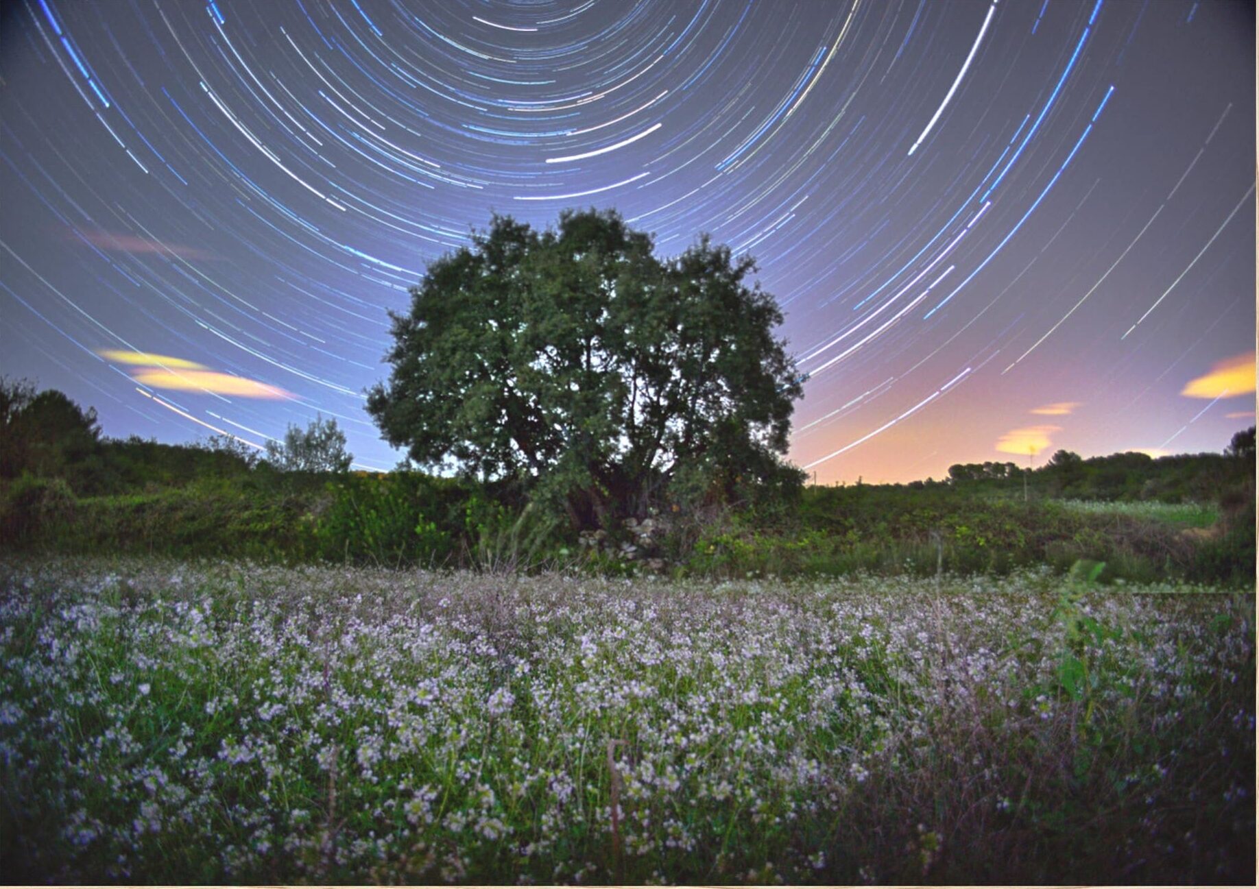 «Bajo el manto nocturno, un árbol solitario se alza como guardián del tiempo, mientras el cielo danza en círculos de luz eterna. Las estrellas dejan su rastro, pintando historias invisibles en la bóveda celeste, mientras un campo de delicadas flores duerme en silencio bajo su resplandor.